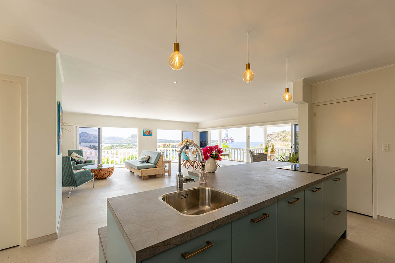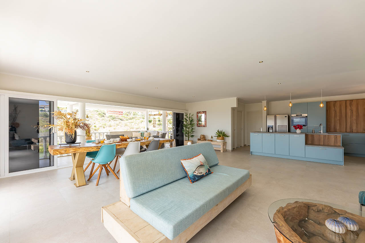 Binnen valt meteen de open en luchtige indeling op, met grote ramen die het spectaculaire uitzicht altijd binnen handbereik brengen. Of je nu aan het ontbijten bent of lekker op de bank zit – de omgeving is voortdurend deel van je verblijf.