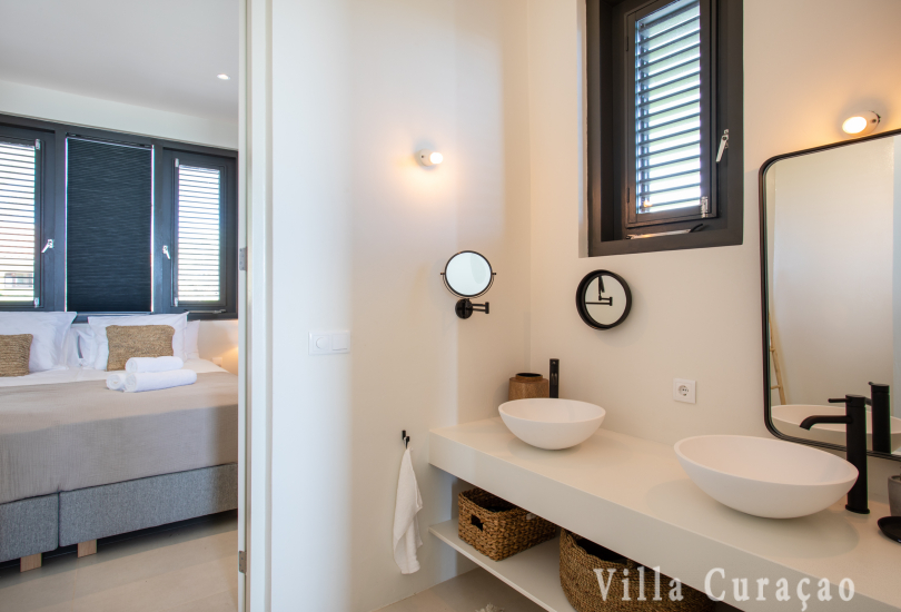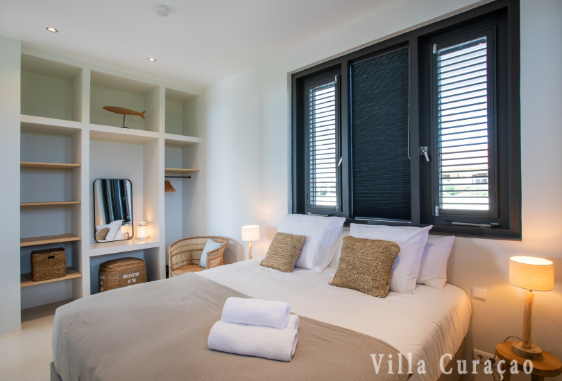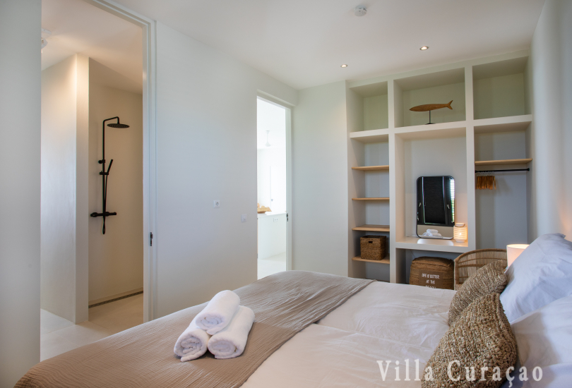 De villa is slim ingedeeld: in het midden vind je het ruime leefgedeelte met woonkamer, keuken en overdekt terras. Aan de linkerkant liggen twee comfortabele tweepersoons slaapkamers die een badkamer delen. Aan de rechterkant bevindt zich een derde tweepersoons slaapkamer met een aangrenzende tv-kamer, die indien gewenst kan worden omgebouwd tot extra slaapkamer met tweepersoonsbed. Ook hier is een badkamer aanwezig.