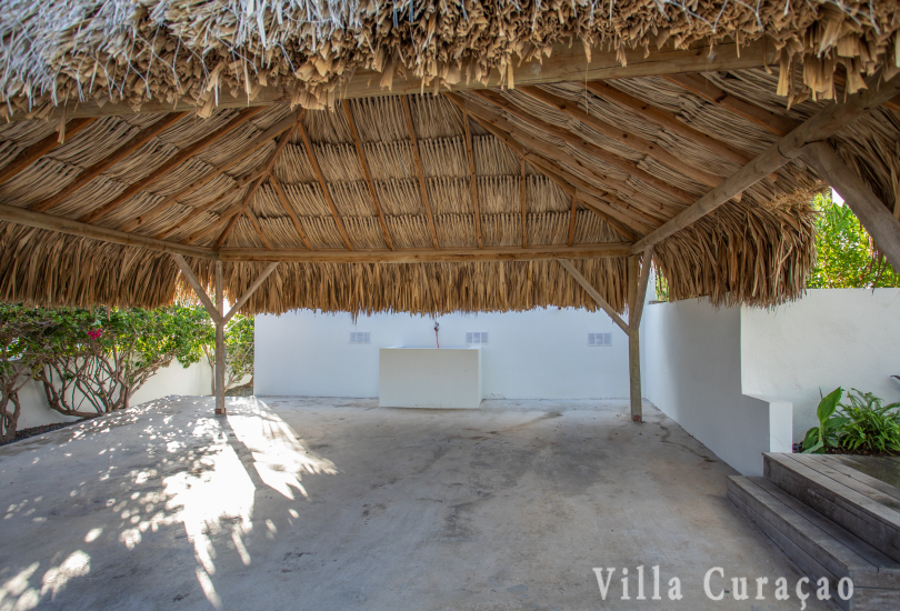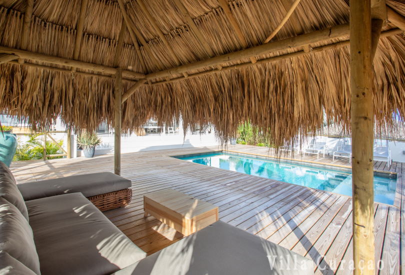 Vanuit het overdekte terras heb je een prachtig uitzicht op het zwembad en de tropische tuin. Op het terras staat een royale eettafel voor gezellige maaltijden, en zijn er comfortabele ligbedden om heerlijk van de zon te genieten. Wie liever wat schaduw zoekt, kan ontspannen onder de palapa met een goed boek of een koel drankje.