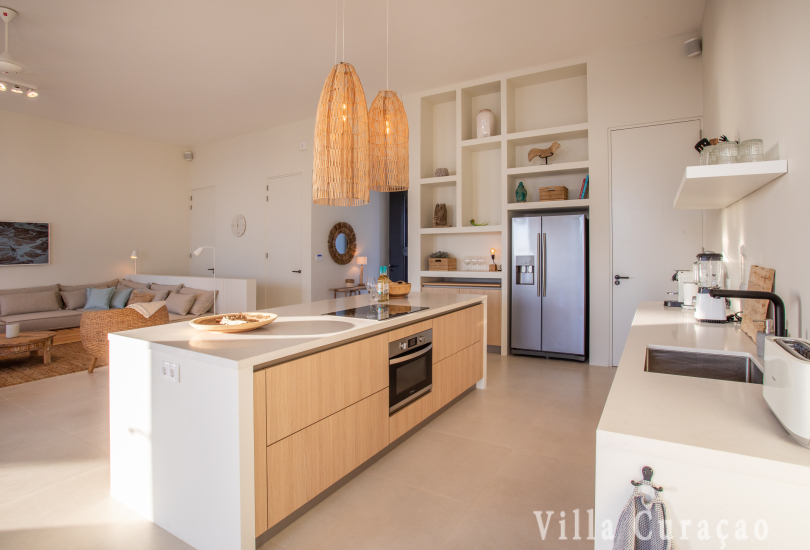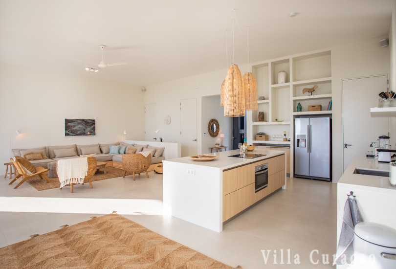 Binnen word je begroet door een lichte, open woonkamer met een hoog plafond. Hier vind je een fijne loungehoek, meerdere zithoekjes en een moderne keuken met kookeiland. De grote Amerikaanse koelkast met ijsblokjesdispenser zorgt dat je altijd kunt genieten van een koel drankje.