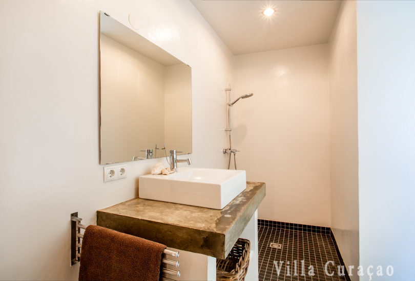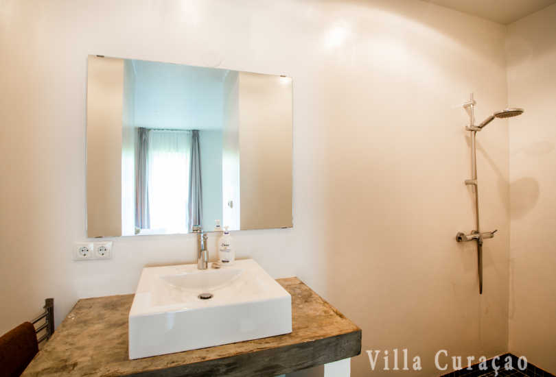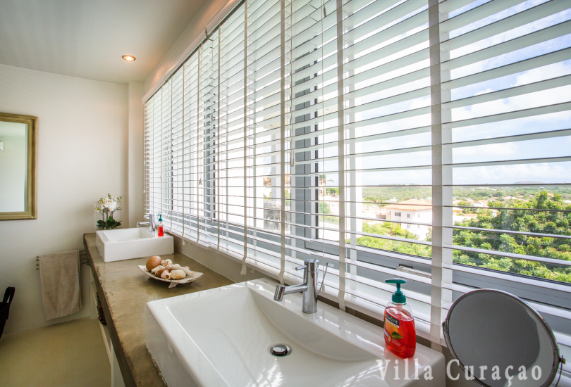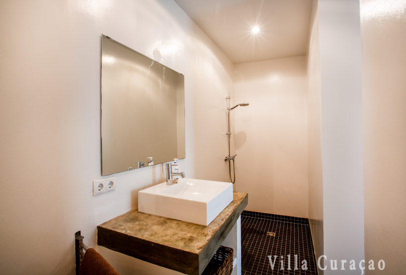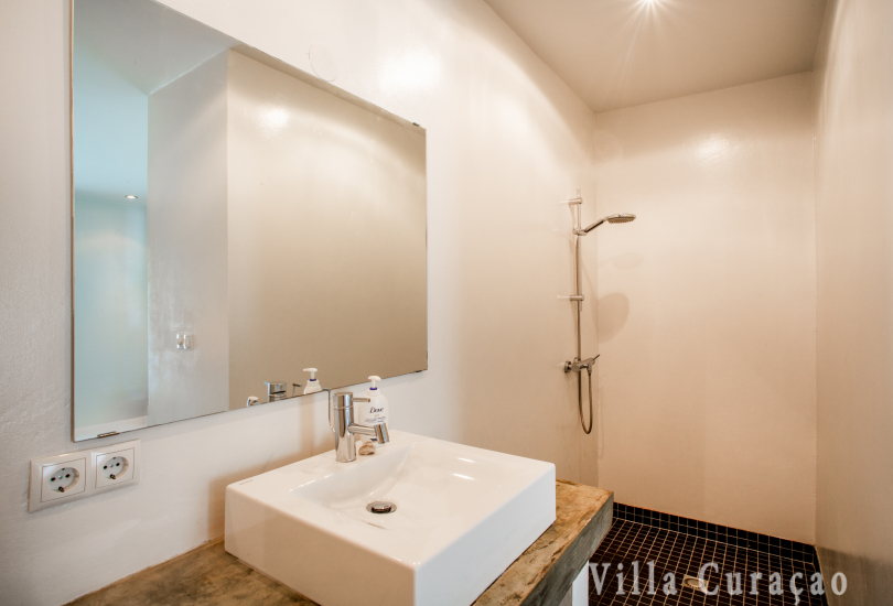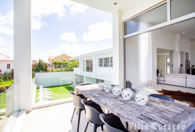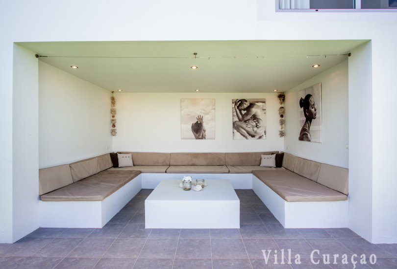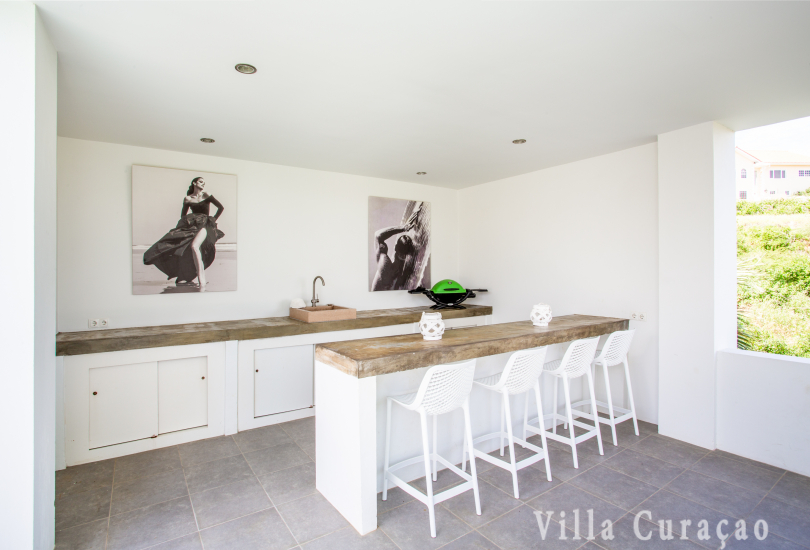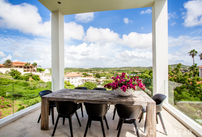 U komt binnen in de bovenste verdieping en direct valt u het heerlijke binnen=buiten gevoel op want u kijkt door de grote open achterwand uit op de wijk Bottelier. Hier bevindt zich ook een royaal terras waar het lijkt alsof u zweeft boven de mooie tuin. Omdat de villa tegen een heuvel is gebouwd heeft u een super uitzicht maar ook altijd een heerlijke breeze waardoor het fijn vertoeven is op het terras. Op dit terras staat een grote eettafel waar u de maaltijden kunt genieten.