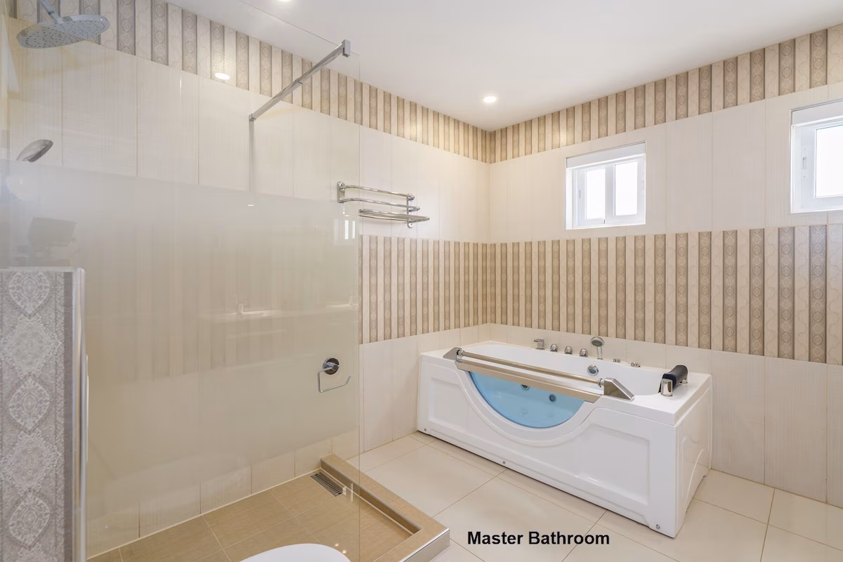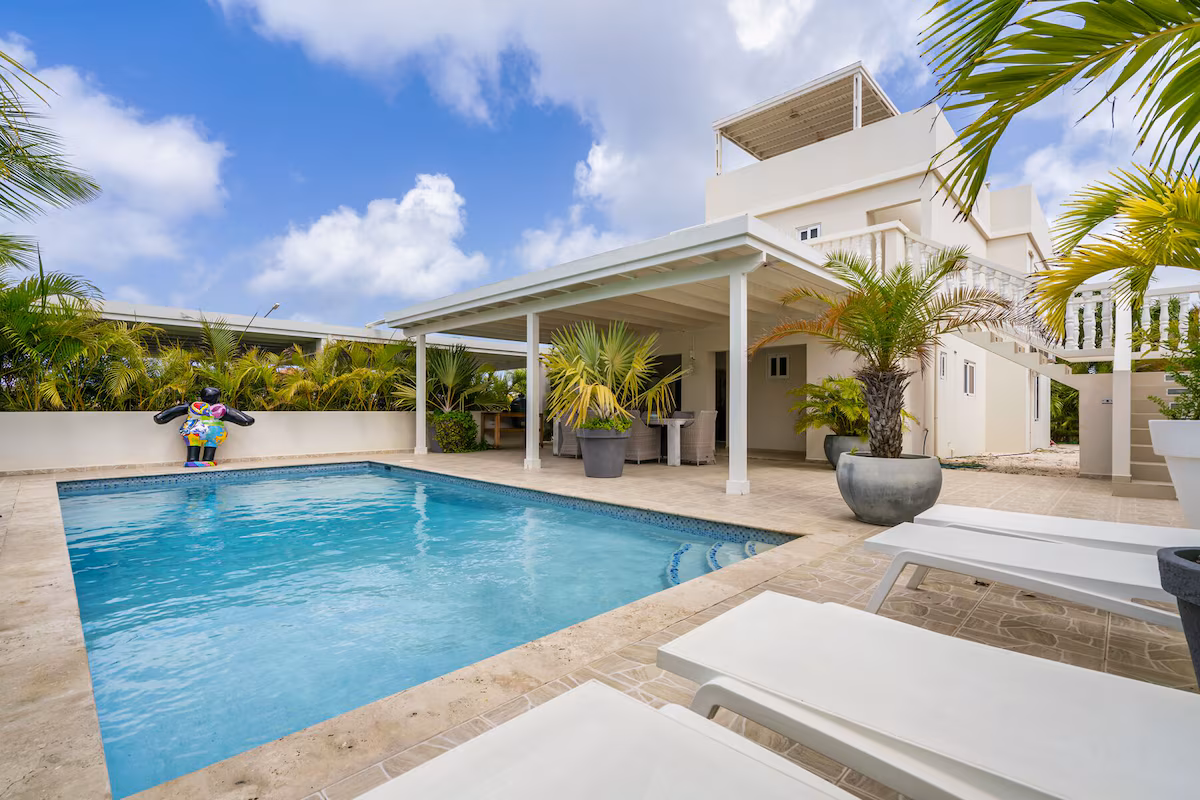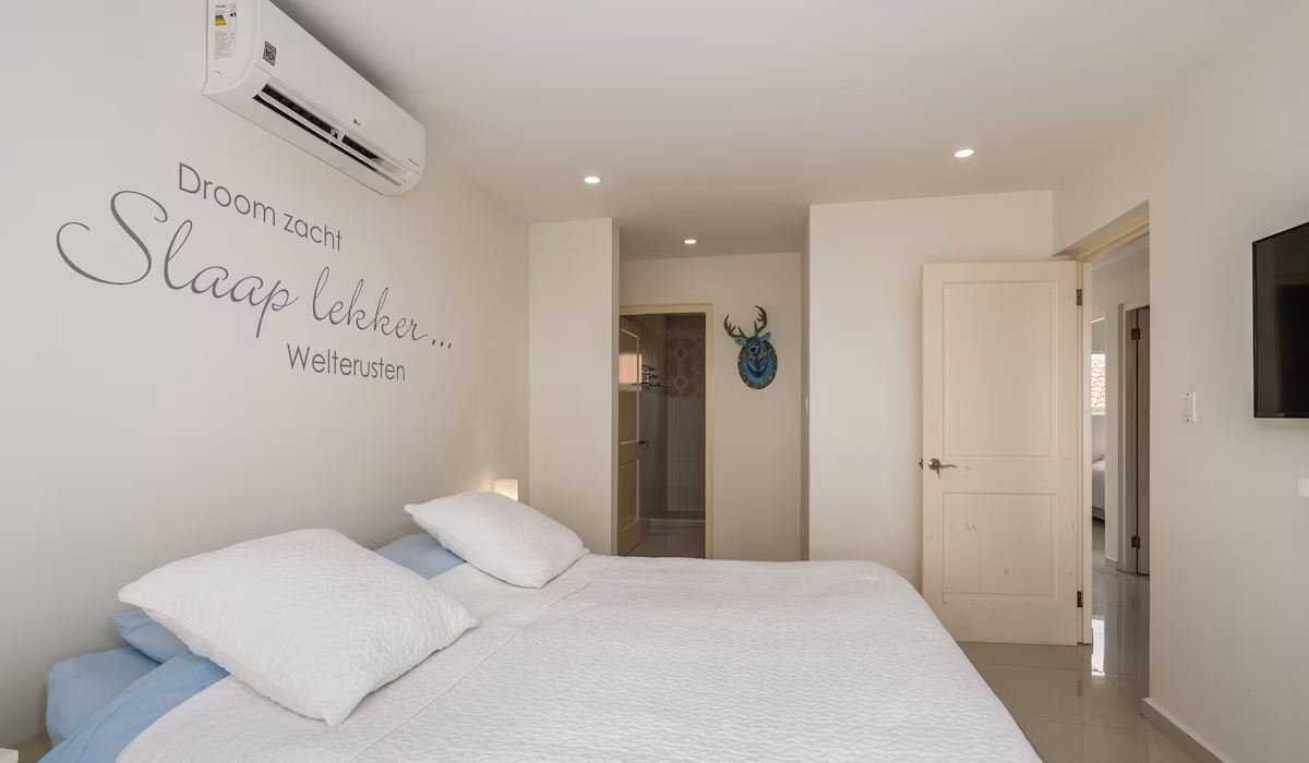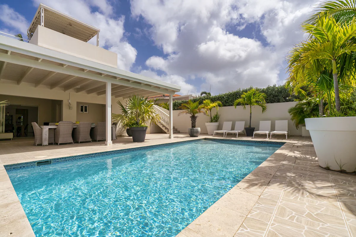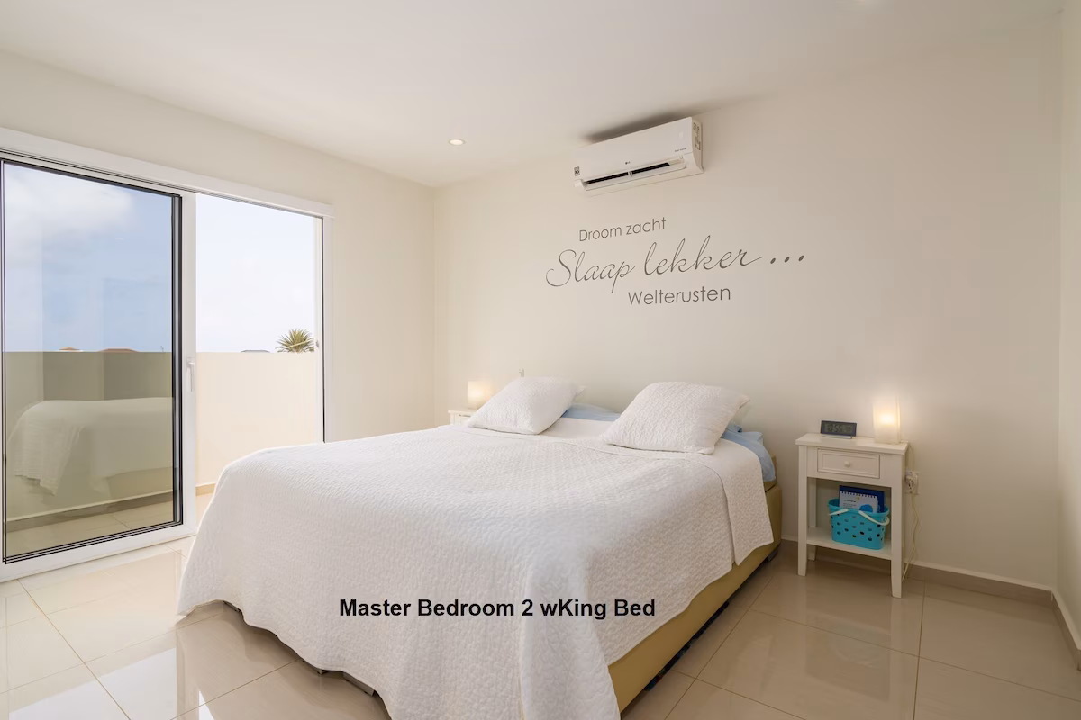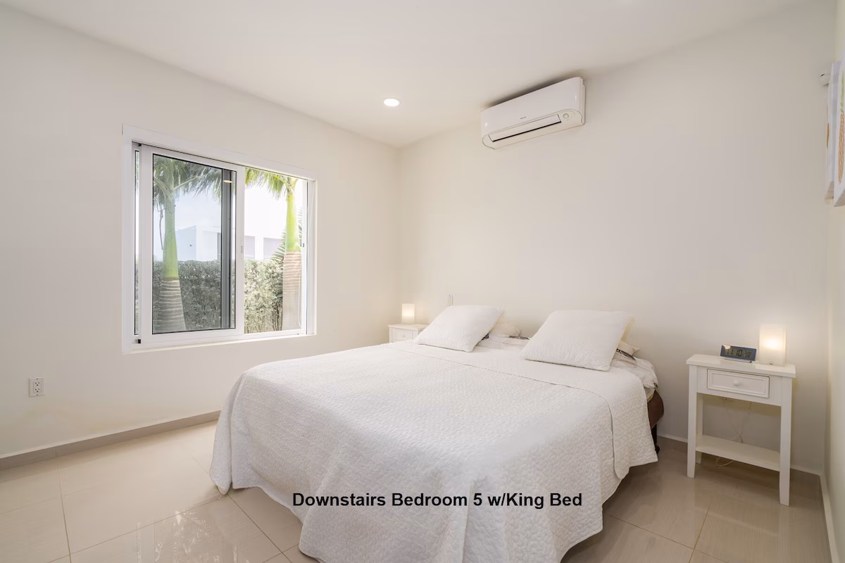 Op de bovenverdieping vind je twee grote slaapkamers met eigen badkamers en toegang tot een overdekt balkon, plus een extra slaapkamer met aparte badkamer. Beneden zijn nog twee slaapkamers die een badkamer delen. Vier slaapkamers beschikken over kingsize bedden, de vijfde is voorzien van een queensize bed. Een extra badkamer bij het zwembad zorgt voor extra gemak.
