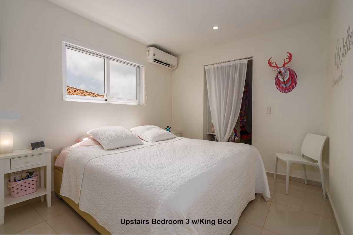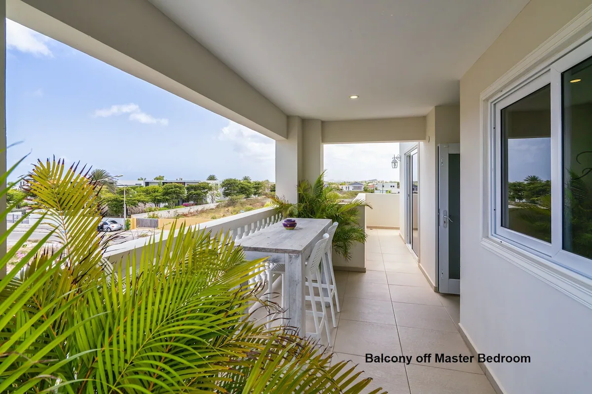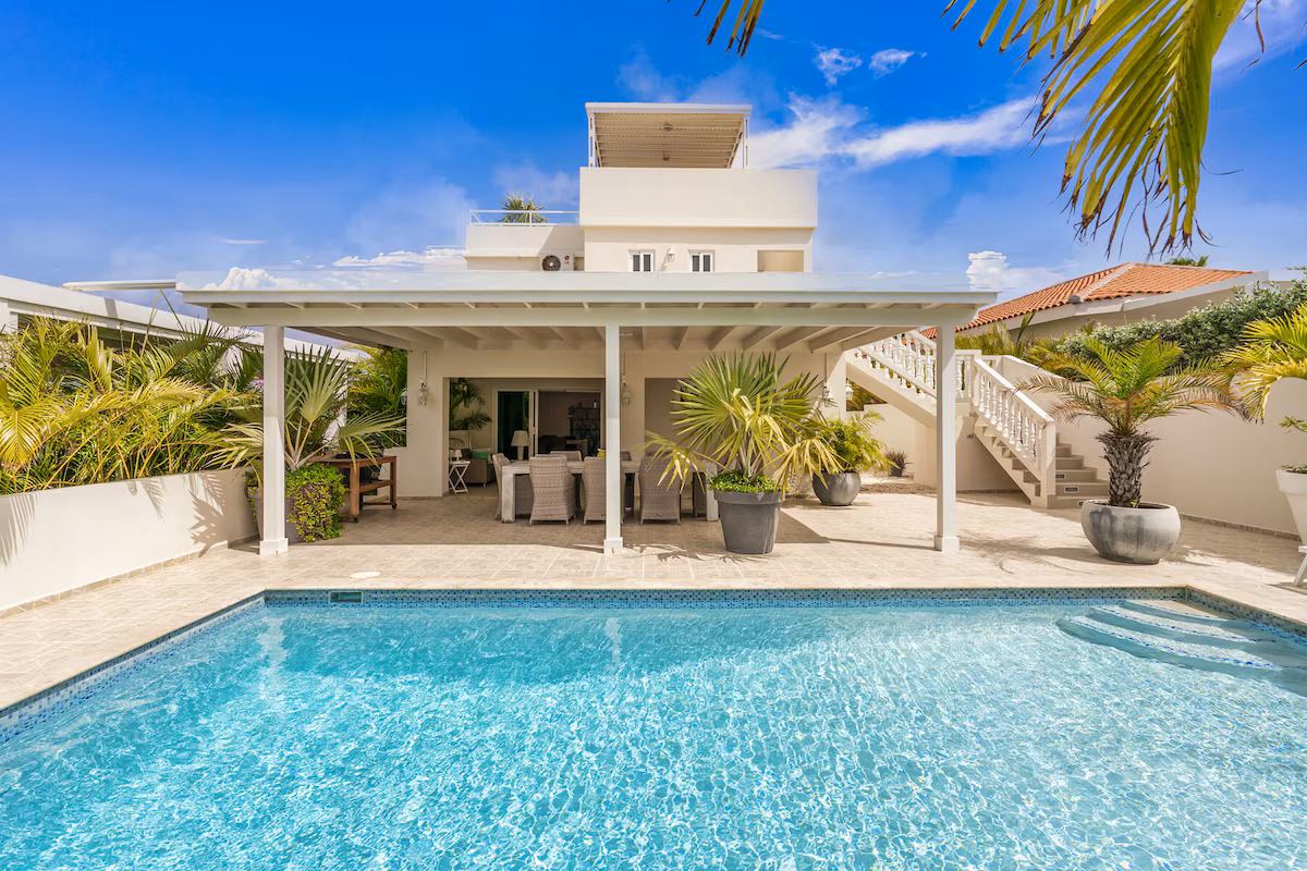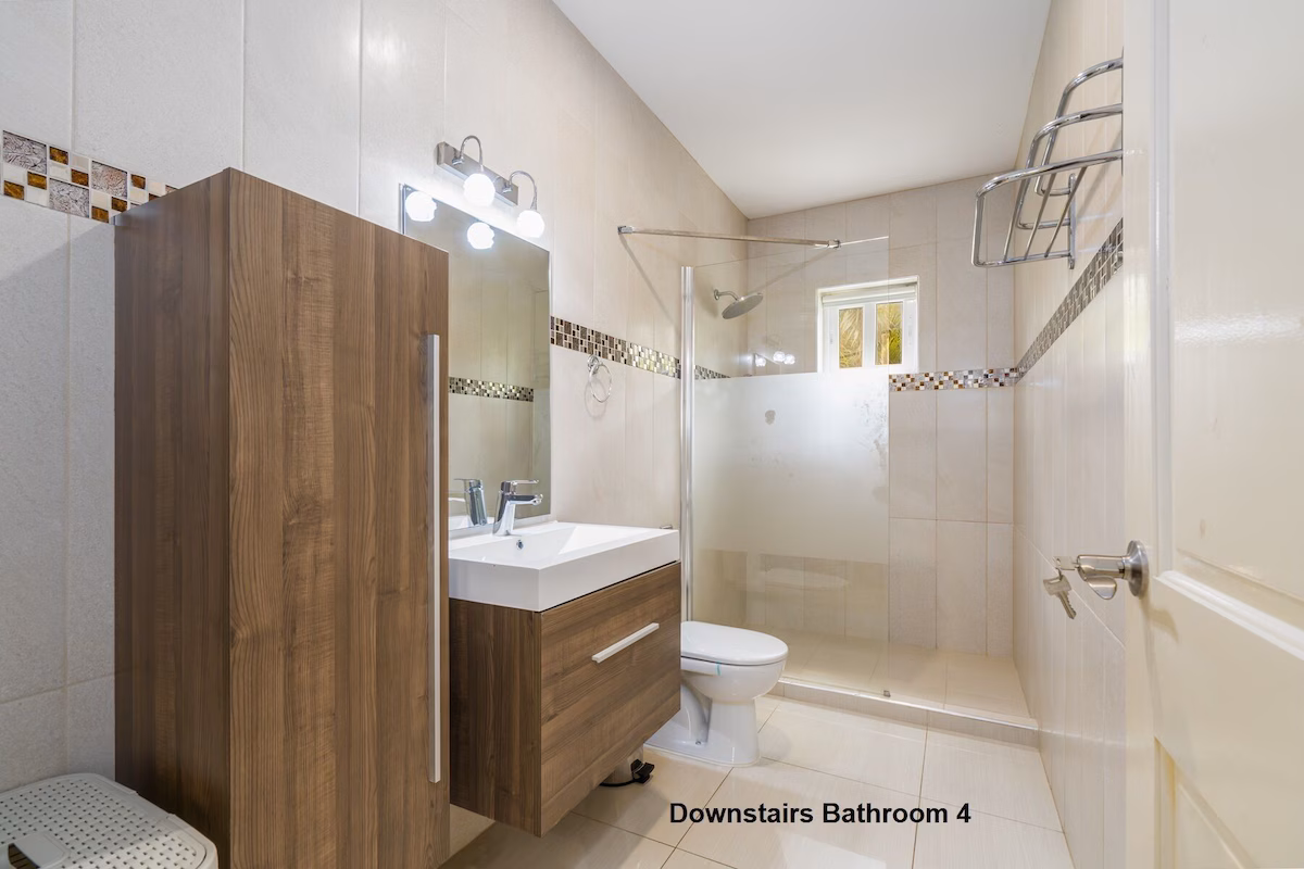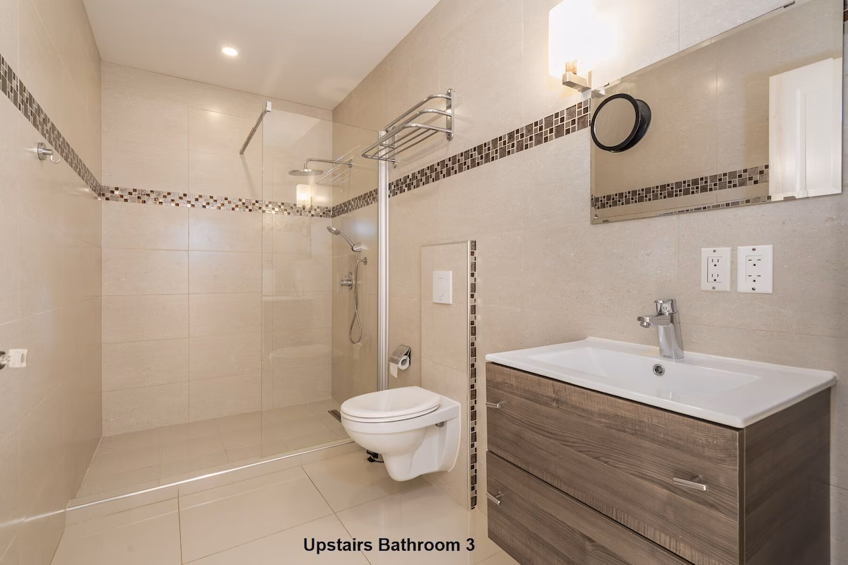 Op de bovenverdieping vind je twee grote slaapkamers met eigen badkamers en toegang tot een overdekt balkon, plus een extra slaapkamer met aparte badkamer. Beneden zijn nog twee slaapkamers die een badkamer delen. Vier slaapkamers beschikken over kingsize bedden, de vijfde is voorzien van een queensize bed. Een extra badkamer bij het zwembad zorgt voor extra gemak.