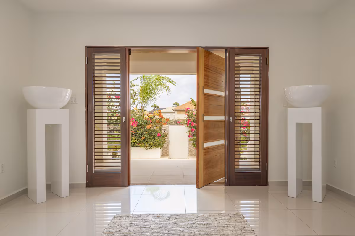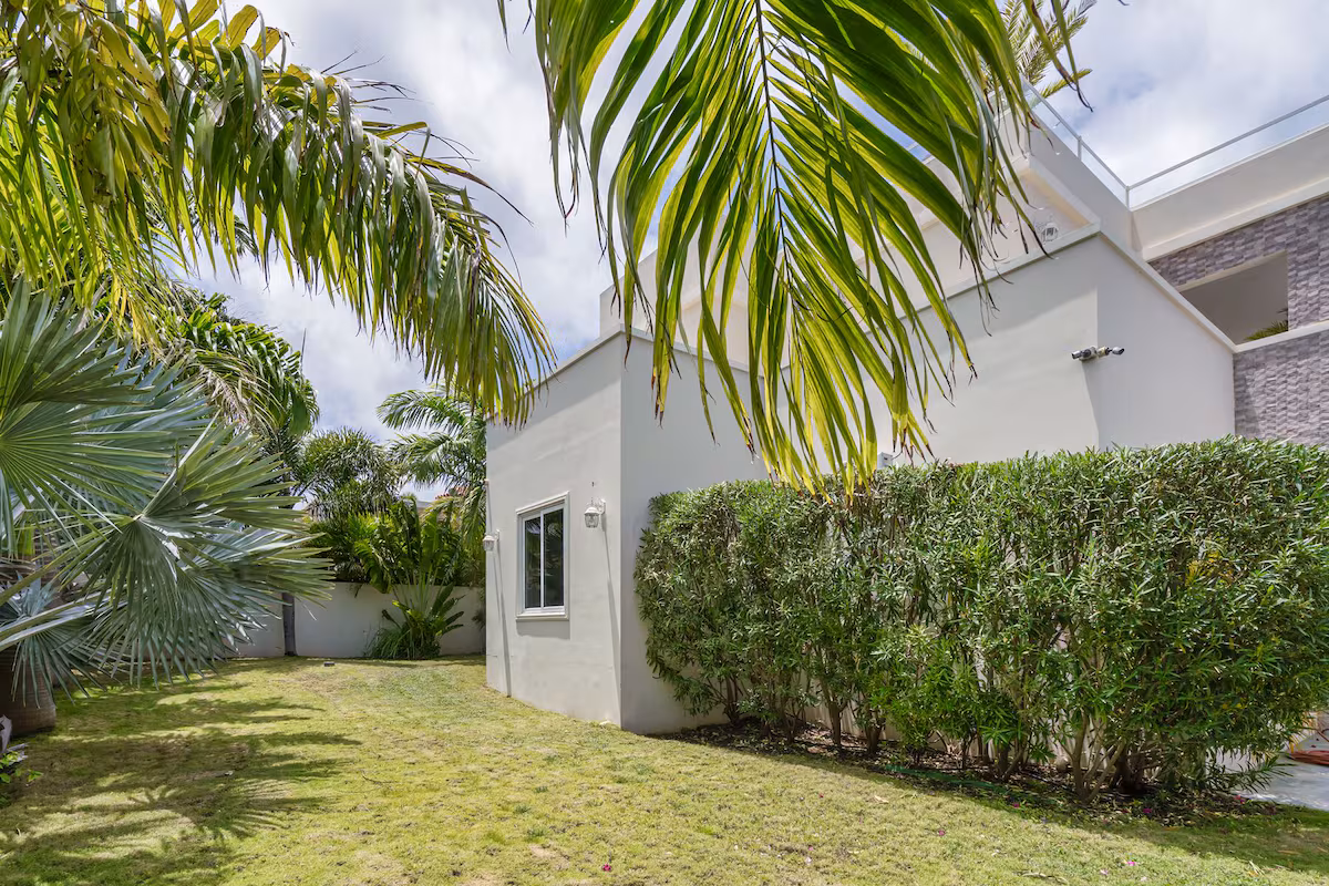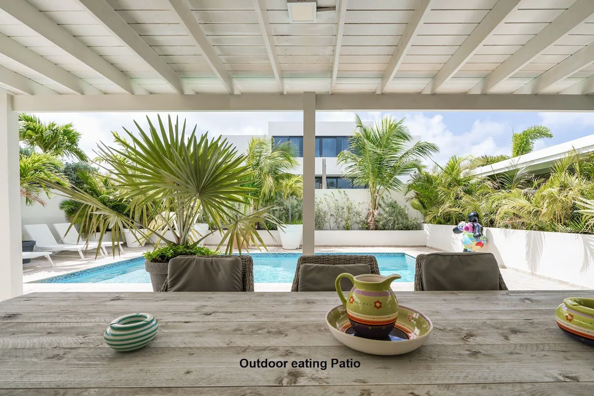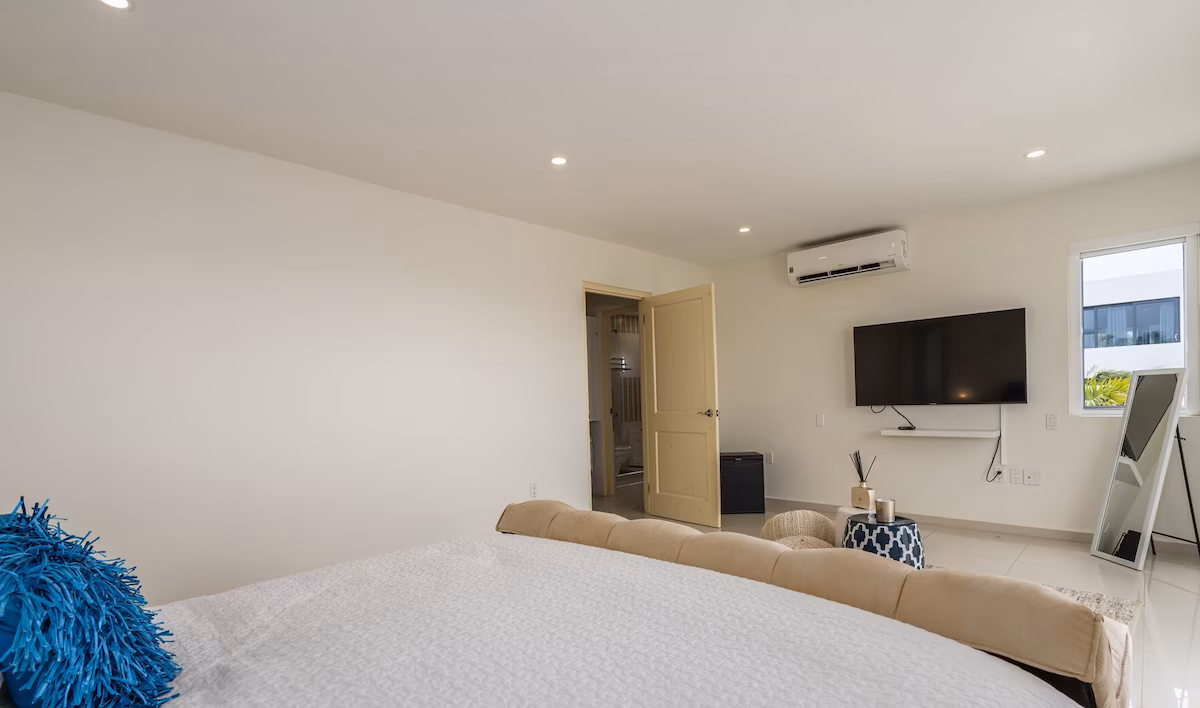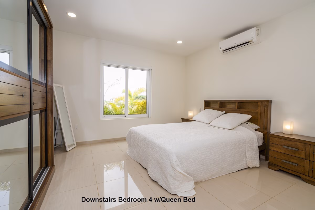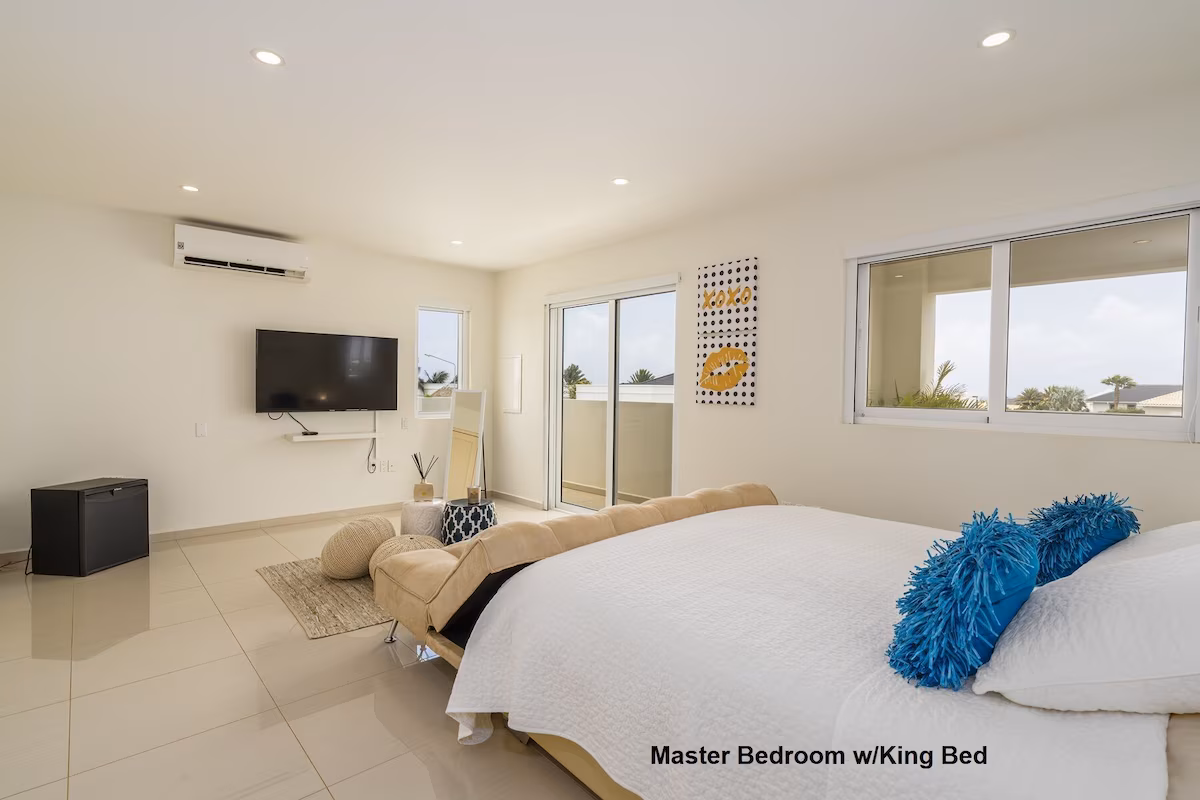 Op de bovenverdieping vind je twee grote slaapkamers met eigen badkamers en toegang tot een overdekt balkon, plus een extra slaapkamer met aparte badkamer. Beneden zijn nog twee slaapkamers die een badkamer delen. Vier slaapkamers beschikken over kingsize bedden, de vijfde is voorzien van een queensize bed. Een extra badkamer bij het zwembad zorgt voor extra gemak.